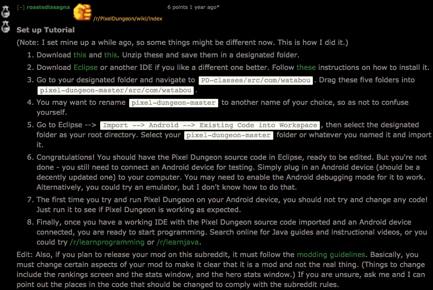 Because eclipse seems easier to mod with the vanilla pixel dungeon (you don't need to worry about the hassle of gradle integration), I'm going to compile a list of ways to do this. Yes, I know this is already a forum topic, but I want to make it easier for people to find the guides, without having to search through other posts.